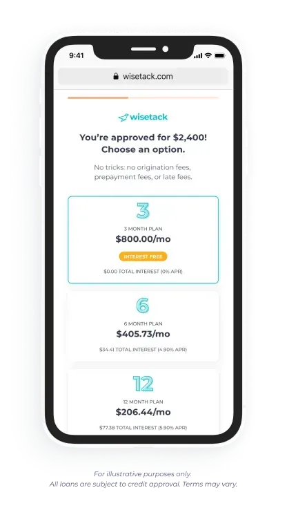 *All financing is subject to credit approval. Your terms may vary. Payment options through Wisetack are provided by our lending partners. For example, a $1,200 purchase could cost $104.89 a month for 12 months, based on an 8.9% APR, or $400 a month for 3 months, based on a 0% APR. Offers range from 0-35.9% APR based on creditworthiness. State interest rate caps may apply. No other financing charges or participation fees. See additional terms at https://wisetack.com/faqs.